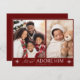 This beautiful Christmas photo card features a red background with 'let us adore him' written in both a classic serif font and a pretty handwritten font, in white, with two stars on either side. This card also accommodates two photos of your family and your name. On the reverse side is the same red background, to which you can add another photo or additional text by selecting the "edit using the design tool" option.