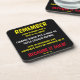 This is an item that I'd recommend for any special occasion or event. A memorable parting souvenir, after a spectacular time with family, friends or co-workers. Happily satisfied with the overall coaster: Bright Vibrant Colors; Accurate print & fonts as chosen; Sturdy material, which will last for a long time; Easy to clean with a wipe or two (don't intend on washing the bottom, which is cork)...