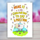L'arrière - plan de cette carte est blanc. Du haut vers le bas est écrit "Voici une petite carte pour vous de dire que vous me manquez". Les lettres sont dessinées à la main, jaune et orange. Les mots sont encadrés de petites fleurs roses et violettes. En dessous se trouve le dessin d'un mignon petit mouton, dessiné dans un style de dessin animé. Il a une fleur rose dans la bouche et sourit au spectateur. Il se tient dans un champ d'herbe verte avec de petites fleurs roses. Derrière les moutons, un ciel bleu est visible