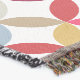 A repeat circular quarters cut out style patterned throw in warm tonal colours of red, browns, grey and blue on a white background by Sarah Trett. Would look great in a bedroom, lounge room.