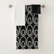 This towel set has a black washcloth, a white hand towel, and a bath towel with a mid-century modern design of a small oval inside a bigger oval on a field of black. Or you can mix and match with the black on white background set.