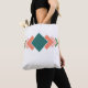 This tote bag has a Bauhaus design of seven overlapping diamonds running vertically along the item in retro colors of blue, pink, and green.
