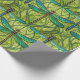 "Repeating dragonfly pattern on green wrapping paper, shown unrolled and flat. The design features teal dragonflies on vibrant green foliage."