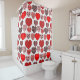 This shower curtain has a Valentine’s design of repeating hearts with different graphics inside on a field of white.
