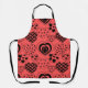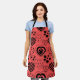 This apron has a Valentine’s design of repeating hearts with different graphics inside on a field of red.