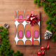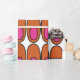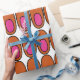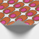 This wrapping paper has a mid-century modern design of repeating orange ovals with pink ovals inside.