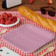 Repeating pattern of small, wavy, reddish-pink lin paper plate