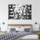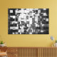 A geometric design in black and white, featuring a mesh of squares and rectangles...