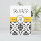 Cartes de réponse RSVP de mariage vintage noir et blanc avec motif damassé et accent de couleur jaune que vous pouvez personnaliser. Un magnifique fond à motif damassé est mis en valeur par un embellissement circulaire et un monogramme sur une ligne jaune contenant les noms des mariés. Les effets Photoshop avec ombres donnent à cette carte un aspect 3D imprimé directement sur le papier de votre choix. Conception de carte de réponse de mariage par Elke Clarke ©2010, 2012. Graphiques sous licence. Une façon élégante de définir le thème de votre mariage. Personnalisez avec vos détails de mariage et les informations de la carte de réponse de mariage pour une collection d'invitations de mariage parfaite.