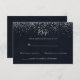 Cette réponse calligraphiée avec confettis argentés est parfaite pour un mariage rustique. Le design simple et élégant présente une typographie classique et fantaisiste avec un fond bleu et des confettis argentés.