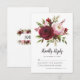 Cartes de réponse de mariage rustique élégant avec un fond blanc uni qui peut être changé en n'importe quelle couleur, une gerbe de fleurs aquarelles rouge marsala, burgundy et rose blush, et un modèle de réponse élégant.