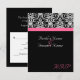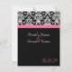 Carte RSVP pour aller avec notre invitation de mariage à fond noir élégant avec accent magenta fuchsia rose chaud. Fond noir frais et élégant avec accent damassé noir et blanc, et bande horizontale colorée. Personnalisez en ligne avec vos détails de mariage.