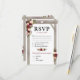 Cartes de réponse de mariage automnal avec un fond blanc chic et élégant qui peut être changé en n'importe quelle couleur, un superbe décor floral aquarelle burgundy, rouge marsala et blush sur une arche de mariage en bois rustique, un cœur sculpté avec les initiales du couple, et un modèle moderne de RSVP de mariage avec une option de menu.