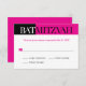 Une carte de réponse conçue pour ressembler à la tête de maquette d'un magazine commence la célébration pour votre fille Bat mitzvah. Cette carte de réponse comporte le titre "Bat mitzvah" dans un panneau noir et fuchsia riche en haut. Texte de réponse customisé imprime ci-dessous. Ajoutez le nom du Bat mitzvah et la date de l'événement ou d'autres informations au verso. Contactez cette boutique si vous avez besoin d'une personnalisation plus poussée ou si vous souhaitez ajouter un nom hébreu. Disponible en couleurs alternatives avec options pour le Bar Mitzvah.