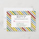 Une élégante carte RSVP avec un arrière - plan à bande métallique en or, argent et bleu, rouge et vert faux parties scintillant amusant.