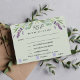 Un arrière - plan vert sage, du texte noir. Décoré de fleurs de lavande et de verdure d'eucalyptus. Personnalisez et ajoutez la réponse par date et sélections de menu. Arrière : couleur arrière - plan verte sauge
