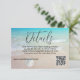 Carte de détails de mariage avec un thème de plage et option de réponse en ligne. Écriture moderne "détails" (ou RSVP) en haut avec un paragraphe de texte imprimé et espace pour l'URL du site web si nécessaire. Inclut un code QR pour que les invités accèdent facilement à un emplacement de réponse, ou vous pouvez supprimer l'image du code dans l'outil de conception - "personnaliser davantage". L'eau bleue tropicale et le sable de la plage constituent l'arrière-plan avec un petit dollar de sable blanc.