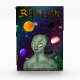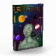 Extra terrestrial art with a reptilian alien with a background of stars and planets.