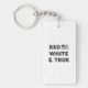 This keychain features a bold and patriotic design with the phrase “RED WHITE & TRUE” in capitalized letters. The design includes an image of the United States flag in grayscale, positioned to the right of the text. Made from high-quality, durable material, this keychain is perfect for showcasing your national pride. Its compact size makes it a stylish and practical accessory for your keys, bags, or as a thoughtful gift.
