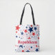 This medium size tote bag is shown with a patriotic stars print with Republican text.