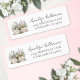 Une étiquette d'expédition d'adresse de retour douce et élégante inspirée du thème "Un nouveau chapitre commence", idéale pour une baby shower ou une fête de mariage. Sur le côté gauche, un livre ouvert aquarellé présente des fleurs sauvages et de la verdure qui se déversent dans des tons rose blush doux, jaune, bleu et violet pour un look léger et joyeux.