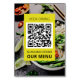 This is a simple green "scan and order our menu" table sign with business qr code and text in black. It is used to indicate where customers can scan and place their orders. Clear message and easy to spot. A great order pickup sign for restaurants, shops, and other small businesses.