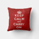 Un coussin amusant, drôle et inspirant "Restez calme et continuez" d'une affiche de guerre britannique 2ème guerre mondiale vintage, vous aide à garder la tête d'un cool en temps stressant. présente texte blanc et emblème de couronne sur un arrière - plan rouge en détresse.