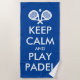 Restez calme et jouez au padel tennis de plage cadeau de serviette pour coach ou joueur. Jolie serviette de plage personnalisée pour lui. Faites votre propre serviette de bain amusante pour la piscine, la plage ou les sports. Présence humoristique pour joueur de padel, coach, entraîneur sportif, enseignant, enfants, retraité, amis, famille, fille, garçon, adolescent, etc. Personnalisable en différentes couleurs. Exemple de couleur bleue et blanche. modèle de typographie audacieux. Ajoutez votre nom, une citation ou un dicton amusant. Raquettes croisées et logo de la boule.