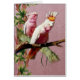 Gorgeous tropical parrots. These pink Cockatoos are resting on a branch with soft pink floral pattern background. Customize inside with your text or delete if you prefer blank.
