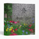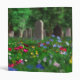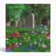 A quiet cemetery in the spring, filled a riot of cornflowers, poppies, dandelions, and many other flowers sprinkled though the green grass and among the gravestones. In the foreground is a tombstone engraved with a Celtic cross and the one word "Resurgam" - Latin for "I shall rise again".