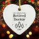 First Christmas as a retired doctor heart ornament for a retirement of a coworker, friend, or family member. Elegant porcelain ceramic holiday ornaments in white with black lettering. Featuring Christmas trees and stars.