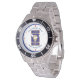 Has heft and feel of expensive stainless steel quartz watches. Good band with safety catch. I removed links, which is easy because engraved arrows show direction to push the linking pins. As always by this seller, the image (a railroad logo) is a perfect reproduction of my emailed image, and is precisely spaced and aligned.