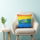 The pillow has an artistic, colourful painted background with bands of vivid colours: orange, yellow, green, sky blue, and ocean blue.