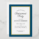 This retirement party invitation offers a stylish professional layout with a dark blue border accented with a thinner gold foil border. Custom text allows you to add your retirement party details.