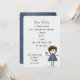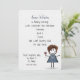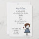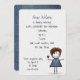 Cute stick girl with red wine in glass, hair, sneakers, and blue jean dress on a soft white background for a retirement party.