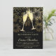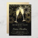 A Retirement party invitation featuring champagne glasses, balloons and gold glitter, gold on black. Faux gold foil on the the back of the invite.