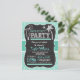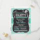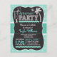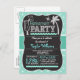 Tropical retirement party invite with retro chalkboard look fonts on aqua turquoise circles pattern. Invitation features chalk look cocktail and palm tree clipart with ric rac design elements.