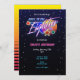Retour à l'invitation des années 80 avec une typographie de style néon "RETOUR AUX ANNÉES 80''. Cette conception comprend des éléments de violet foncé, de bleus, de jaune, d'orange et de rose, un soleil néon et des formes, ainsi que des éléments de design inspirés des années 80. Les produits comprennent un modèle pour une personnalisation personnelle.