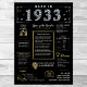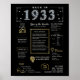 Embarquez pour un voyage en 1933 avec notre affiche numérique captivante, remplie de faits historiques, de faits saillants et de nouvelles intrigantes d'années passées. Équipé de faux accents dorés et argentés sur fond noir, orné d'icônes distinctives et d'une typographie audacieuse, ce poster rayonne d'une élégance intemporelle. Qu'il s'agisse d'allumer des conversations lors de fêtes d'anniversaire ou d'anniversaires, ou lorsqu'il est encadré avec goût, il évolue en gardien chéri, subissant n'importe quel espace avec une allure nostalgique. Éblouissez vos proches avec notre affiche imprimable Back in 1933, un cadeau distinctif débordant de nostalgie et de caractère. Riche d'idées captivantes, il offre un voyage personnalisé à travers l'histoire, ce qui en fait un choix idéal pour commémorer un événement d'anniversaire spécial. Plongez-vous dans la riche tapisserie de 1933, plongez dans des événements importants, des phénomènes culturels, des inventions pionnières, des coûts typiques des biens, des tendances de mode et des noms de bébé populaires de l'époque. De la construction monumentale du barrage Hoover et du pont Golden Gate à des percées scientifiques comme la découverte de Pluton et du neutron, notre affiche résume l'essence d'une période de transformation. Entrez dans le monde glamour de 1933 avec des aperçus des tendances de la mode comme les robes Flapper et les Casquettes Cloche, accompagnés de termes en argot qui définissaient l'époque. Explorez les coûts moyens d'articles quotidiens comme une miche de pain ou un gallon de gaz, offrant un aperçu captivant de la vie quotidienne il y a près d'un siècle. Avec notre affiche soignée, plongez-vous dans les vues et les sensations d'une époque révolue, célébrant l'héritage durable de 1933 avec un style sans pareil.