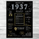 Faites un voyage vers 1937 avec notre affiche digitale fascinante, méticuleusement conçue avec des faits historiques, des nouvelles dignes de mention, et de charmantes anecdotes d'autrefois. Ornée de faux ornements or et argent contre un arrière - plan noir captivant, et agrémentée d'icônes uniques et d'une typographie audacieuse, cette affiche respire une sophistication intemporelle. Qu'il s'agisse d'animer des discussions animées lors de fêtes d'anniversaire ou d'anniversaires, ou d'élégamment encadré comme un souvenir chéri, il imprègne tout espace au charme nostalgique. Impressionnez vos proches avec notre affiche imprimable de 1937, un cadeau nostalgique plein de caractère. Surplombant des perspectives captivantes, il propose un voyage personnalisé à travers l'histoire, parfait pour commémorer les événements marquants de l'anniversaire. Plongez dans la tapisserie vibrante de la vie de 1937, en explorant des événements importants, des tendances culturelles, des inventions révolutionnaires, des prix typiques des produits de base, des vogues de mode et des noms populaires de bébé de l'époque. De la grandeur du barrage Hoover et du pont Golden Gate à des jalons scientifiques comme la découverte de Pluton et du neutron, notre affiche résume l'essence d'une époque transformatrice. Entrez dans le royaume glamour de 1937 avec des aperçus de modes tels que les robes Flapper et les Casquettes Cloche, accompagnés de l'argot qui a défini l'époque. Plongez dans les coûts moyens des nécessités quotidiennes comme une miche de pain ou un gallon d'essence, offrant un aperçu fascinant de la vie quotidienne il y a près d'un siècle. Avec notre affiche minutieusement décorée, plongez-vous dans les vues et les sensations d'une époque révolue, célébrant l'héritage durable de 1937 avec un style inégalé.