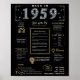 Entrez en 1959 avec notre affiche d'anniversaire numérique captivante, remplie de faits historiques, d'événements remarquables et d'histoires intrigantes du passé. Ornée d'élégants détails dorés et argentés contre un arrière - plan noir audacieux, avec des symboles uniques et un texte élégant, cette affiche d'anniversaire dégage un charme intemporel. Qu'il s'agisse d'allumer des conversations lors de réunions d'anniversaire ou de se faire chérir comme gardien, il évoque des souvenirs nostalgiques. Notre affiche d'anniversaire offre un aperçu de 1959, explorant des aspects comme le revenu moyen, les inventions populaires, les événements importants, les tendances de la mode et l'argot de l'époque. Il met en lumière des moments clés tels que la première émission de télévision couleur, le baby-boom d'après-guerre, l'essor du rock and roll et le développement du vaccin contre la polio. Des inventions notables comme le photocopieur, la batterie alcaline et la bombe à hydrogène sont également présentées, montrant les avancées technologiques de l'époque. Dans l'ensemble, l'affiche d'anniversaire saisit l'essence de la vie dans les années 1950, englobant la technologie, les frais de vie et les tendances culturelles comme la musique et la mode. Il sert de pièce de conversation mémorable lors de fêtes d'anniversaire et d'anniversaires et fait un souvenir réfléchi lorsqu'il est encadré.