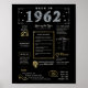 Entrez en 1962 avec notre affiche d'anniversaire numérique captivante, riche de faits historiques, d'événements remarquables et d'histoires intrigantes du passé. Décorée d'élégants détails dorés et argentés, collés à un audacieux arrière - plan noir, arborant des symboles uniques et un texte élégant, cette affiche d'anniversaire dégage un charme intemporel. Qu'il s'agisse d'allumer des conversations lors de réunions d'anniversaire ou de se faire chérir comme gardien, il évoque des souvenirs nostalgiques. Notre affiche d'anniversaire donne un aperçu de 1962, explorant des aspects tels que le revenu moyen, les inventions populaires, les événements importants, les tendances de la mode et l'argot de l'époque. Il met en lumière des moments clés tels que l'avènement de la première calculatrice portative, l'atterrissage de la Lune américaine, le mouvement pour les droits civiques et l'approbation de la pilule contraceptive. Des inventions remarquables, comme le premier laser, le stimulateur cardiaque et la valve cardiaque artificielle, sont également présentées, montrant les avancées technologiques de l'époque. Dans l'ensemble, l'affiche d'anniversaire reflète l'essence de la vie dans les années 1960, englobant la technologie, les frais de vie et les tendances culturelles comme la musique et la mode. Il sert de pièce de conversation mémorable lors de fêtes d'anniversaire et d'anniversaires et fait un souvenir réfléchi lorsqu'il est encadré.