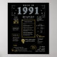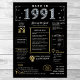 Entrez en 1991 avec notre affiche d'anniversaire numérique captivante, débordant de faits historiques, d'événements importants et de récits fascinants du passé. Orné d'élégants accents or et argent sur fond noir, ce poster d'anniversaire dégage un charme intemporel. Notre affiche d'anniversaire offre un aperçu intrigant de 1991, se penchant sur des aspects tels que le revenu moyen, les inventions notables, les événements importants, les tendances de la mode et les expressions familières de l'époque. Il met en lumière des moments clés comme la bulle Dot-Com, l'émergence des boys bands, l'avènement d'Internet par accès commuté et la panique du Y2K. Des inventions dignes d'intérêt comme le World Wide Web, la messagerie texte, le MP3 et l'appareil photo numérique sont en vedette, reflétant les progrès technologiques remarquables de l'époque. Dans l'ensemble, l'affiche d'anniversaire saisit l'essence de la vie des années 1991, englobant à la fois l'innovation technologique et les phénomènes culturels tels que la musique et la mode. Il sert de point de départ captivant pour les célébrations d'anniversaire et les anniversaires, et lorsqu'il est élégamment encadré, il évolue en un souvenir chéri, préservant l'esprit des temps pour les générations à venir.