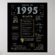 Revenez en 1995 avec notre affiche d'anniversaire numérique captivante, riche de faits historiques, d'événements importants et de récits enchanteurs du passé. Orné d'élégants accents dorés et argentés sur fond noir, ce poster d'anniversaire dégage un charme intemporel. Notre affiche d'anniversaire donne un aperçu fascinant de 1995, explorant des facettes telles que le revenu moyen, les inventions notables, les événements importants, les tendances de la mode et les expressions familières de l'époque. Il met en lumière des moments charniers comme la bulle Dot-Com, la montée des boys bands, l'émergence d'Internet par accès commuté, et l'inquiétude généralisée à propos de l'an 2000. D'importantes inventions telles que le World Wide Web, la messagerie texte, la technologie MP3 et l'appareil photo numérique sont mises en valeur, reflétant les progrès technologiques remarquables de l'époque. Dans l'ensemble, l'affiche de l'anniversaire résume l'essence de la vie dans les années 1990, en capturant à la fois l'innovation technologique et les phénomènes culturels comme la musique et la mode. Il sert d'amorce de conversation intéressante pour les célébrations d'anniversaire et les anniversaires, et lorsqu'il est élégamment encadré, il se transforme en un souvenir chéri, préservant l'esprit des temps pour les générations à venir.