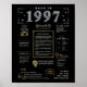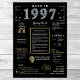 Revenez en 1997 avec notre affiche d'anniversaire numérique captivante, riche de faits historiques, d'événements importants et de récits enchanteurs du passé. Orné d'élégants accents dorés et argentés sur fond noir, ce poster d'anniversaire dégage un charme intemporel. Notre affiche d'anniversaire donne un aperçu fascinant de 1997, explorant des facettes telles que le revenu moyen, les inventions notables, les événements importants, les tendances de la mode et les expressions familières de l'époque. Il met en lumière des moments charniers comme la bulle Dot-Com, la montée des boys bands, l'émergence d'Internet par accès commuté, et l'inquiétude généralisée à propos de l'an 2000. D'importantes inventions telles que le World Wide Web, la messagerie texte, la technologie MP3 et l'appareil photo numérique sont mises en valeur, reflétant les progrès technologiques remarquables de l'époque. Dans l'ensemble, l'affiche de l'anniversaire résume l'essence de la vie dans les années 1990, en capturant à la fois l'innovation technologique et les phénomènes culturels comme la musique et la mode. Il sert d'amorce de conversation intéressante pour les célébrations d'anniversaire et les anniversaires, et lorsqu'il est élégamment encadré, il se transforme en un souvenir chéri, préservant l'esprit des temps pour les générations à venir.