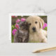 This beautiful cute golden retriever puppy and a cute grey kitten cuddling together outside on the green grass with a pink flower behind them.