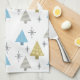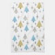 A festive mid century modern art design with atomic age style christmas trees in gold, silver and light blue, and starbursts.