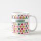 This fun and festive mug features a pattern of circles and vertical stripes in red, lime green, orange, pink and dark green against a white background. This retro style mug is ready to be personalized with a name in dark green lettering. The pattern wraps around the mug and the name appears on both sides of the mug.