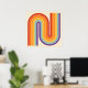 This artwork channels a retro graphic spirit, forming the letter‑like curve with parallel bands of red, orange, yellow, light blue, teal, and purple. The layered arcs flow in harmony, evoking the bold optimism of 1970s design. Set against a soft beige background, the vibrant rainbow palette stands out with clarity and rhythm. The composition balances simplicity and dynamism, creating a timeless visual that feels both nostalgic and modern.