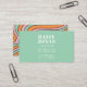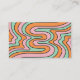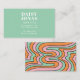 A groovy retro 70's style abstract style business card featuring eye catching abstract wavy lines, and a chunky retro typeface for your name. Colourful and bold in hues of blue green, orange, pink.